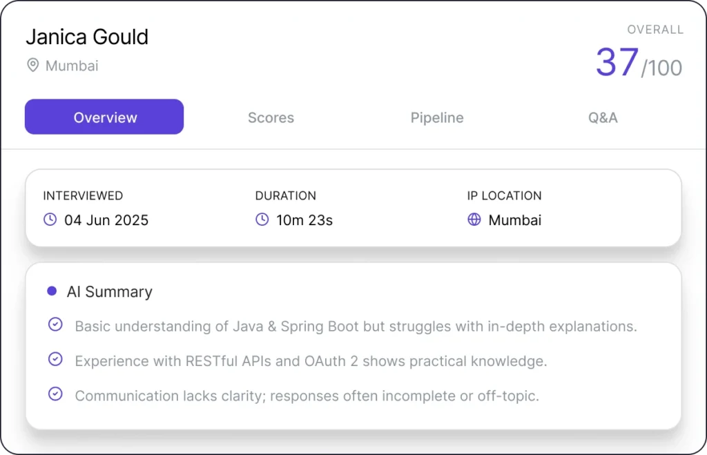 AI Interview empowers easy, initial screening, precisely identifying candidates with maximum role alignment. AI interview ensures fair interview experience with consistency