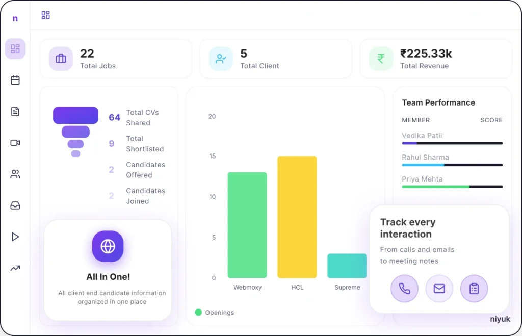 Keep all your client and candidate information organized in one powerful dashboard, so you never miss an update or opportunity.