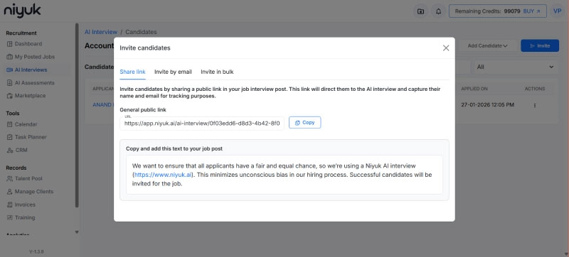 - It will take you to the Invite Candidates window. You will be on the Share the link menu option. Another two options you can browse are – “Invite by email” and “Invite in bulk”. A message for ‘Interview Created Successfully’ will be displayed.