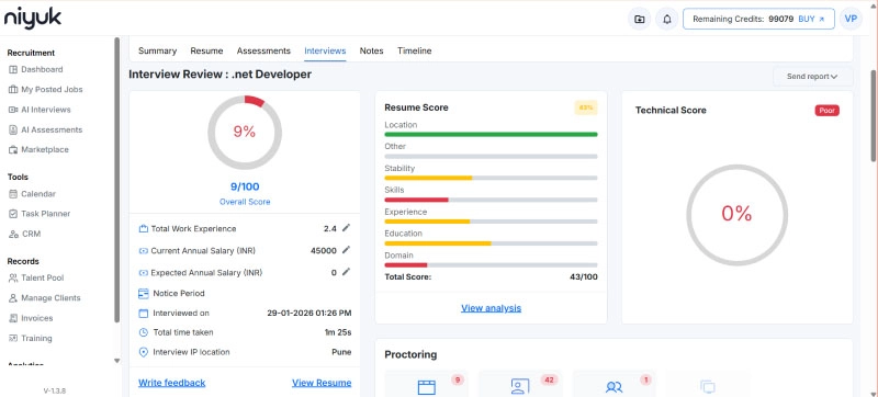 - Upon giving the AI interview, questioned one by One by AI, the Assessment review with Resume matching scores is displayed at the end of it. Also, A video clip is attached for reference with it.