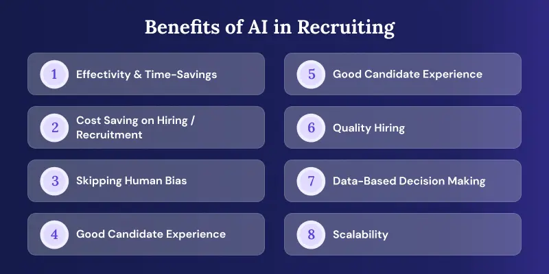 AI is transforming the recruitment arena because of its unmatched advantages. By offering remarkable advantages like time saving, enhanced candidate matching, cost reduction, best candidate experiences and so much more.